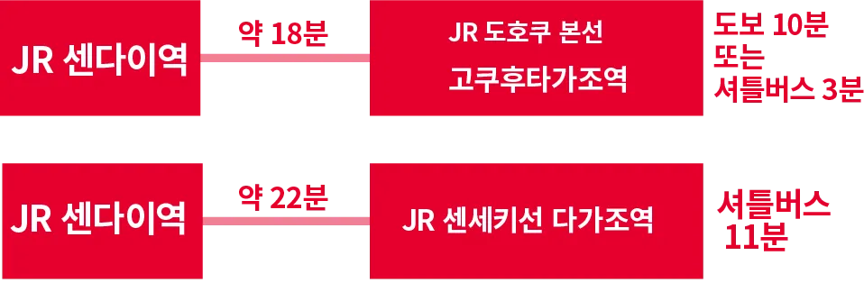 - JR 센세키선 다가조역 남쪽 출구, JR 도호쿠 본선 고쿠후타가조역 북쪽 출구, 다가조 성터 주차장(다가조 성터 아야메엔) 3개소를 9:30부터 17:00까지 15분 간격으로 순회합니다.